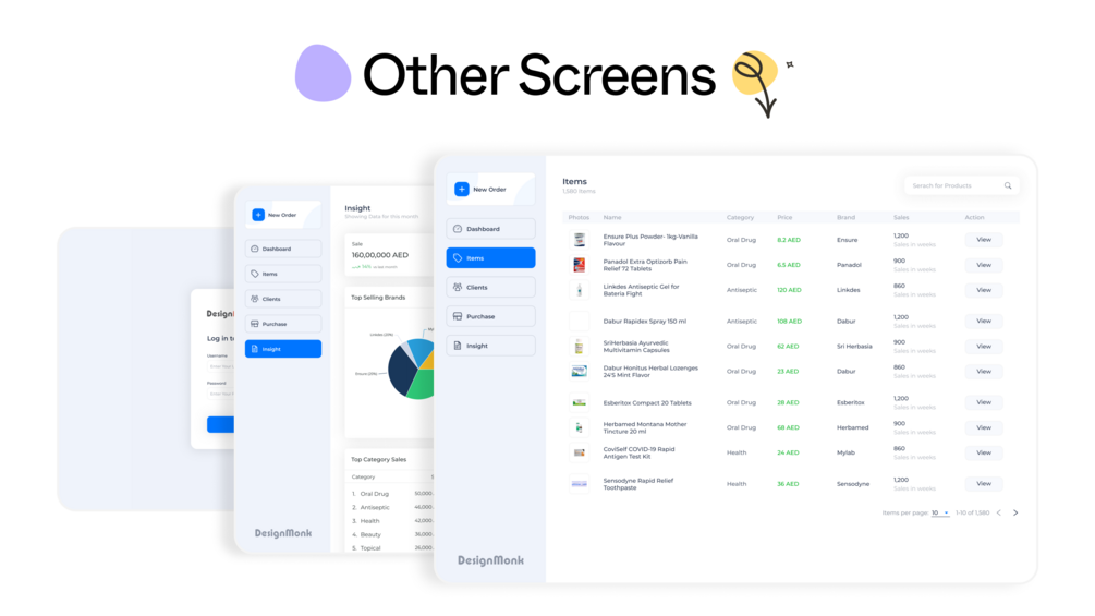- UI Screens: Comprehensive set of UI screens including Dashboard, Login, Sales Order, Purchase Order, Reporting Screens, and Inventory List."