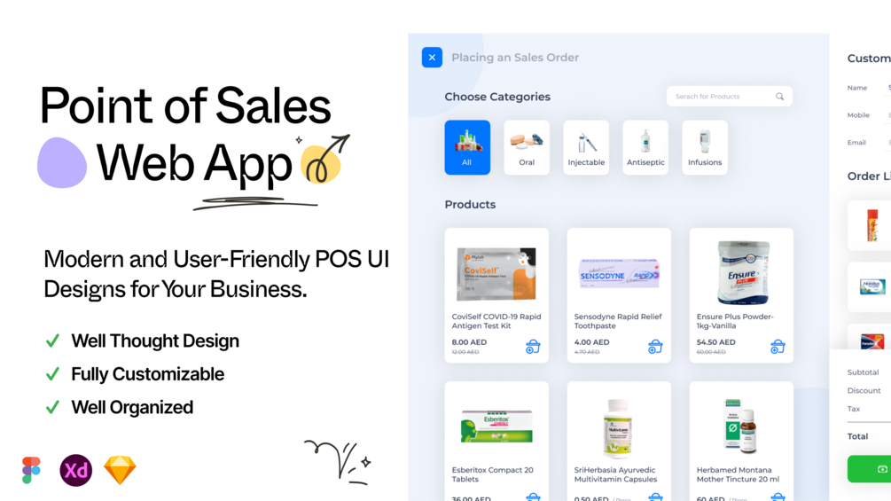 Set of POS Web App UI screens, including Dashboard, Login, Sales Order, Purchase Order, Reporting Screens, and Inventory List.. Multi-Format Files: Available in Figma, Sketch, and Adobe XD for easy customization and integration.